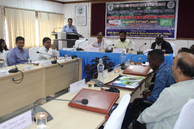 The ICAR-Indian Institute of Soil and Water Conservation (IISWC), Dehradun organized a six-day study tour cum exposure visit programme on Bamboo Allometrics, Hydrology and environmental Metrics for the scientists from Kenya Forest Research Institute (KEFRI), Kenya from August 21-26, 2023. On 22 August, while inaugurating the function, Dr. Charan Singh, Officiating Director, highlighted the work done by the institute for rehabilitation of degraded lands. He discussed the different bamboo-based technologies developed by the institute for degraded ravine lands and sloping lands of western Himalayas. He also emphasized on future collaborations with KEFRI and INBAR. Dr. R.K. Singh emphasized the importance of conserving green and blue water while efficiently utilizing grey water. Dr. JMS Tomar, Head Plant Science Division stressed the importance of agroforestry and fruit trees in resource conservation and providing livelihood security. He also highlighted the work done by the Plant Science Division in TSP and SCSP programme. Dr. Gopal Kumar highlighted the technologies developed by Soil Science and Agronomy Division, which can play an important role in enhancing productivity of degraded lands. On this occasion, Dr. James Ndufa, Chief Scientist and Incharge of Forest Biodiversity and Environment Management, KEFRI provided a briefing on the state of land degradation in Kenya, revealing that 62% of the land is currently degraded and an additional 21% is considered to be extremely degraded. He emphasized the potential of bamboo as a tool for rehabilitating degraded lands in Kenya and discussed the efforts being made by the government to promote bamboo. Dr. Stanley Nadir, Senior Research Scientist and Deputy Regional Director, emphasized on joint working of IISWC and KEFRI in promoting bamboo research programme.