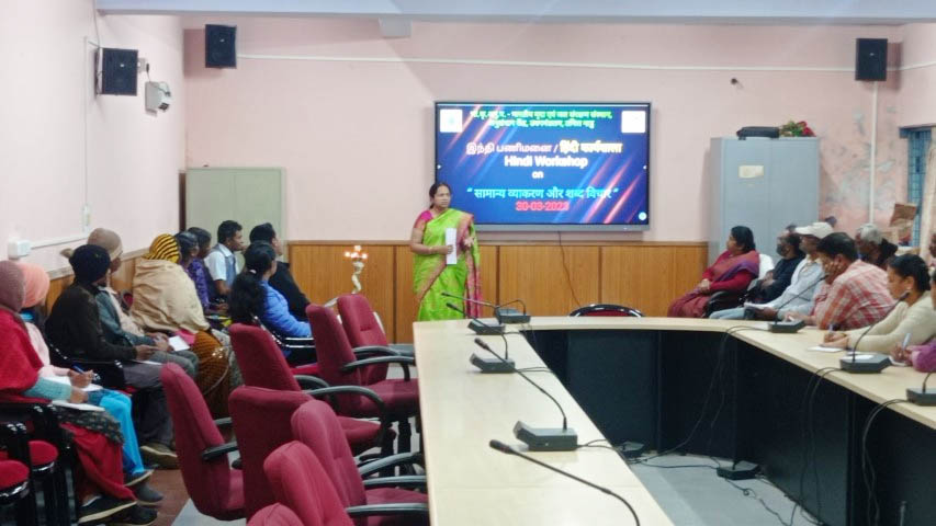भाकृअनुप-भारतीय मृदा एवं जल संरक्षण संस्थान, अनुसंधान केंद्र, उधगमंडलम द्वारा "सामान्य व्याकरण और शब्द विचार" पर त्रैमासिक हिंदी कार्यशाला का दिनांक मार्च 30, 2023 को आयोजन किया गया। कार्यक्रम की शुरुआत श्री जॉर्ज जॉन, टी-6 के स्वागत भाषण से हुई। इसके बाद मंगलाचरण गीत और दीप प्रज्ज्वलित किया गया। डॉ. पी. सुंदरमबल, प्रधान वैज्ञानिक एवं कार्यवाहक केंद्राध्यक्ष ने कार्यक्रम का उद्घाटन किया और हिंदी को एक आधिकारिक भाषा के रूप में बढ़ावा देने और उपयोग करने के लिए केंद्र में की गई विभिन्न गतिविधियों के बारे में जानकारी दी । डॉ. एस.एम. वनिता, वरिष्ठ वैज्ञानिक एवं हिंदी अधिकारी, ने हिंदी में आमतौर पर इस्तेमाल होने वाले विभिन्न आधिकारिक शब्दों और वाक्यों के बारे में बताया। हिंदी में अपना नाम लिखने और हिंदी में संख्या सीखने का अभ्यास करने के लिए सभी कर्मचारियों के साथ एक गतिविधि भी आयोजित की।केंद्र के सभी वैज्ञानिक, तकनीकी, प्रशासनिक और अन्य कर्मचारियों ने कार्यक्रम में सक्रिय रूप से भाग लिया और आधिकारिक नियमित कार्यों में हिंदी शब्दों का प्रयोग सीखा। औपचारिक धन्यवाद ज्ञापन के साथ कार्यक्रम समाप्त हुआ।